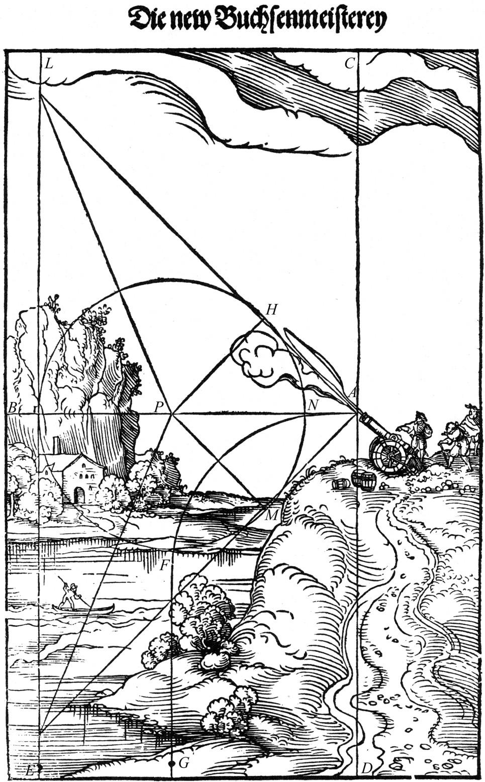 绘制;这里叠印在里夫(Walter H. Ryff)的风景画《几何弹道学》(