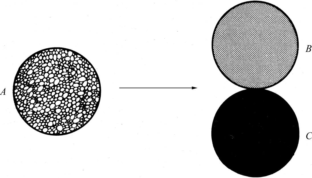 图14 它们将去向何方?按照牛顿运动定律,假定三个球都是完全弹性的,结果则取决于A先撞B还是先撞C。如果A恰巧同时与B、C相撞,牛顿定律确定不了将发生什么情况