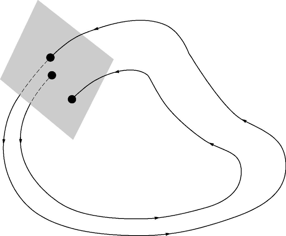 图25 用庞加莱截面检测周期运动。在周期性的情况下,曲线必须在它的精确初始点处回到这个截面
