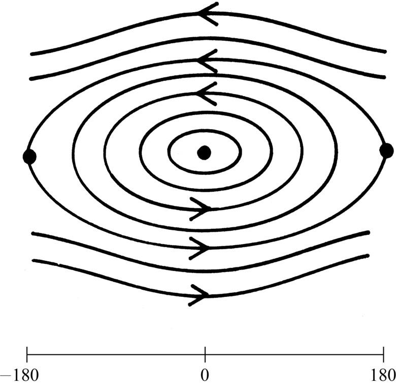 现在考察一条眉毛。这里 v 总是正的,而 x 从-180°(即顺时针方向180°)到+180°转过完整的一周。这是螺旋桨式轨线,在同一方向不断旋转。较低的眉毛代表类似的运动,不过是顺时针的,而不是逆时针的。