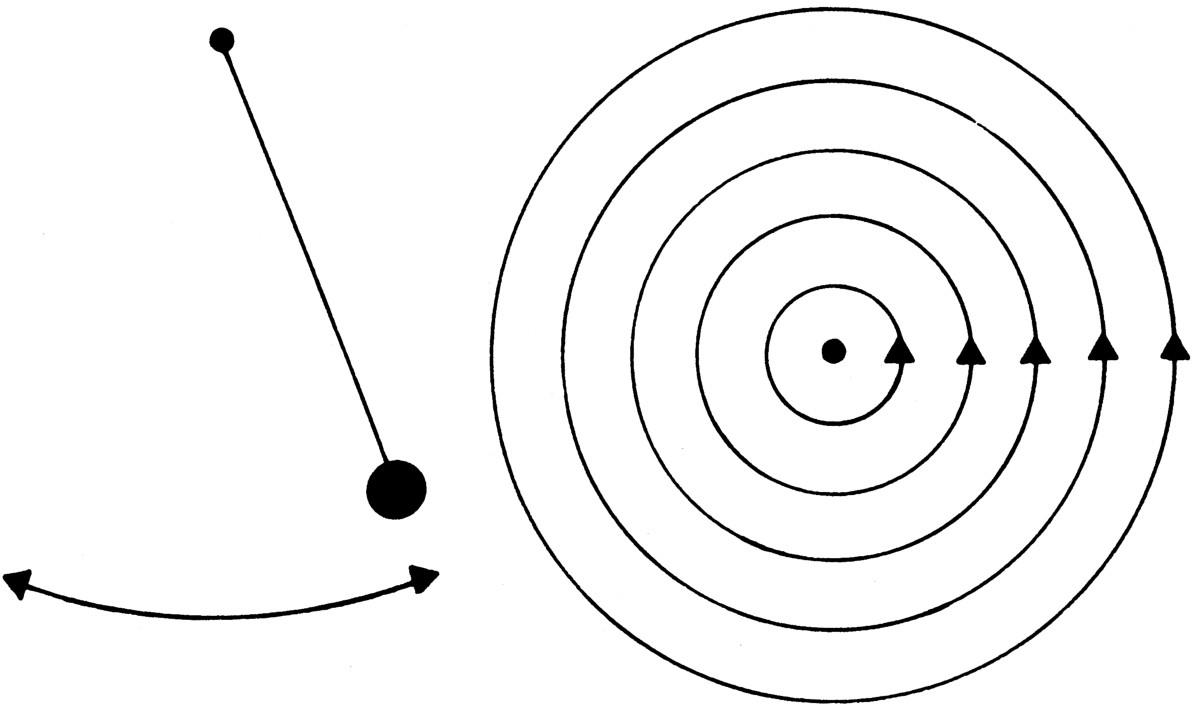 图28 理想化线性摆(左图)的 相图 (右图)。横坐标表示摆的位置,纵坐标表示摆的速度。随着时间的推移,摆的状态描绘出一个圆。哪个圆则取决于初始条件