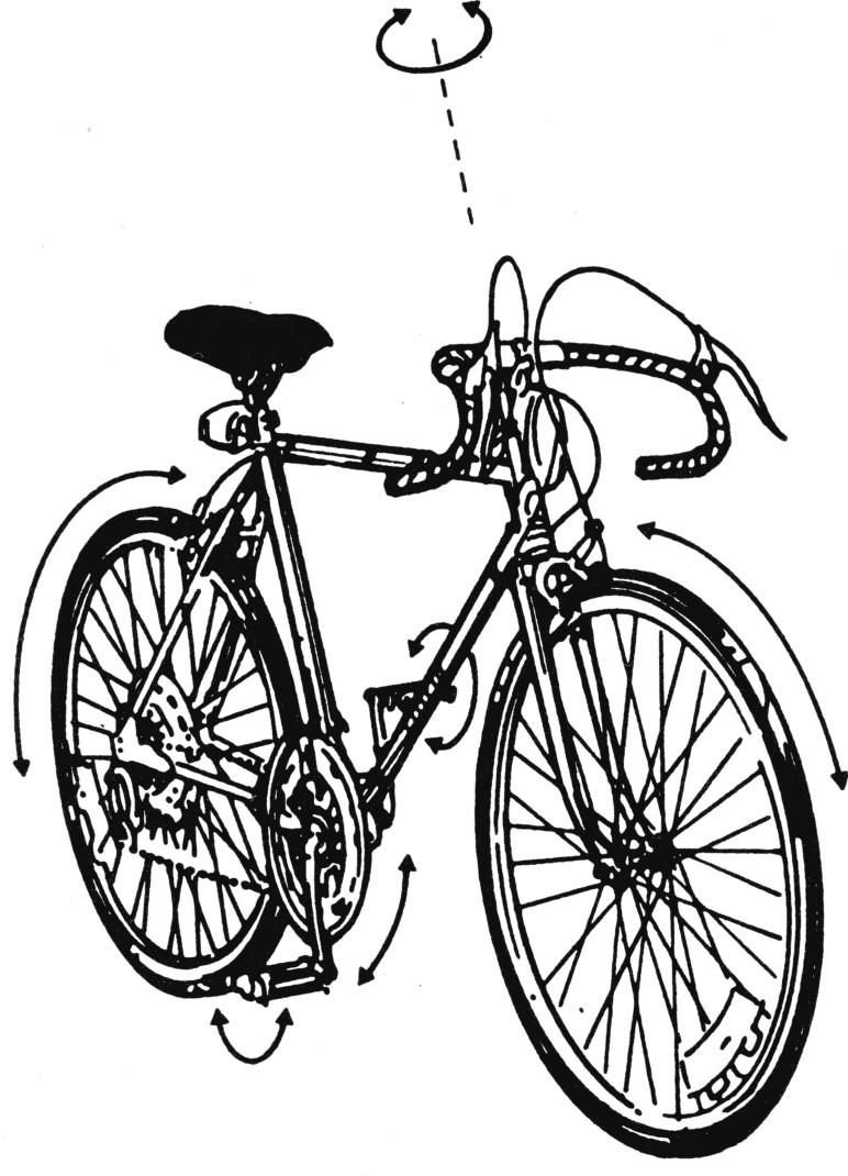 自行车(在保守的估计下)有5个主要运动部件:把手、前轮、曲柄-链条-后轮组合和两块踏板(图34)。每一部件需要一个位置坐标和一个速度坐标来描述它:工程师会说它有“10个自由度”。要骑自行车,你必须把握十维空间中一点的运动!大概这就是自行车那么难学的原因吧。哦,还 没有 就自行车在路上的所在地引入变量。