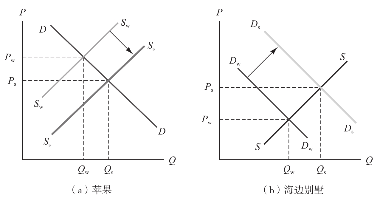 就苹果而言,季节性消费量的增加是供应量增加所致,而就海滨别墅而言,季节性消费量的增加是需求量增加所致。如图2-1所示,这些变化使均衡价格和均衡数量之间出现了明显的季节性关系(见图2-1, P 表示价格, Q 表示数量, S 表示供给, D 表示需求,下标w表示冬天,下标s表示夏天)。当需求增加(如海滨别墅),均衡数量增加,同时,均衡价格出现上涨。当供给增加(如苹果),均衡数量增加,而均衡价格出现下跌。