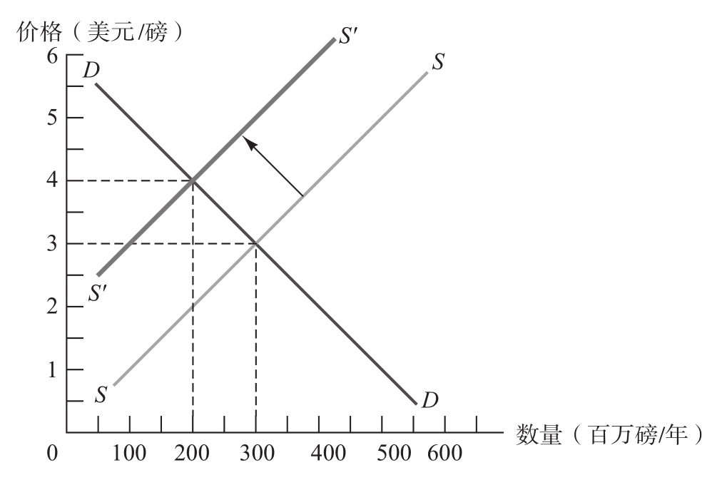 价格补贴制度提高了牲畜饲料的价格,致使牛肉的供应曲线出现向左位移(见图2-2)。反过来,这又导致牛肉均衡价格上涨,均衡数量下跌。
