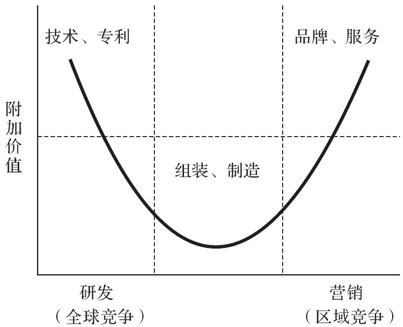 微笑曲线(Smiling Curve,见图4),是宏碁集团董事长施振荣在《再造宏碁:开创、成长与挑战》一书中提出的企业竞争战略。微笑曲线分为左、中、右三段,左段为技术、专利,属于全球竞争;中段为组装、制造;右段为品牌、服务,属于区域竞争;曲线代表的是附加价值,微笑曲线在中段位置的附加价值较低,而在左右两段位置的附加价值较高。微笑曲线的含义是:要增加企业的附加价值,绝不要持续处在组装、制造位置,而要往左端或右端迈进。